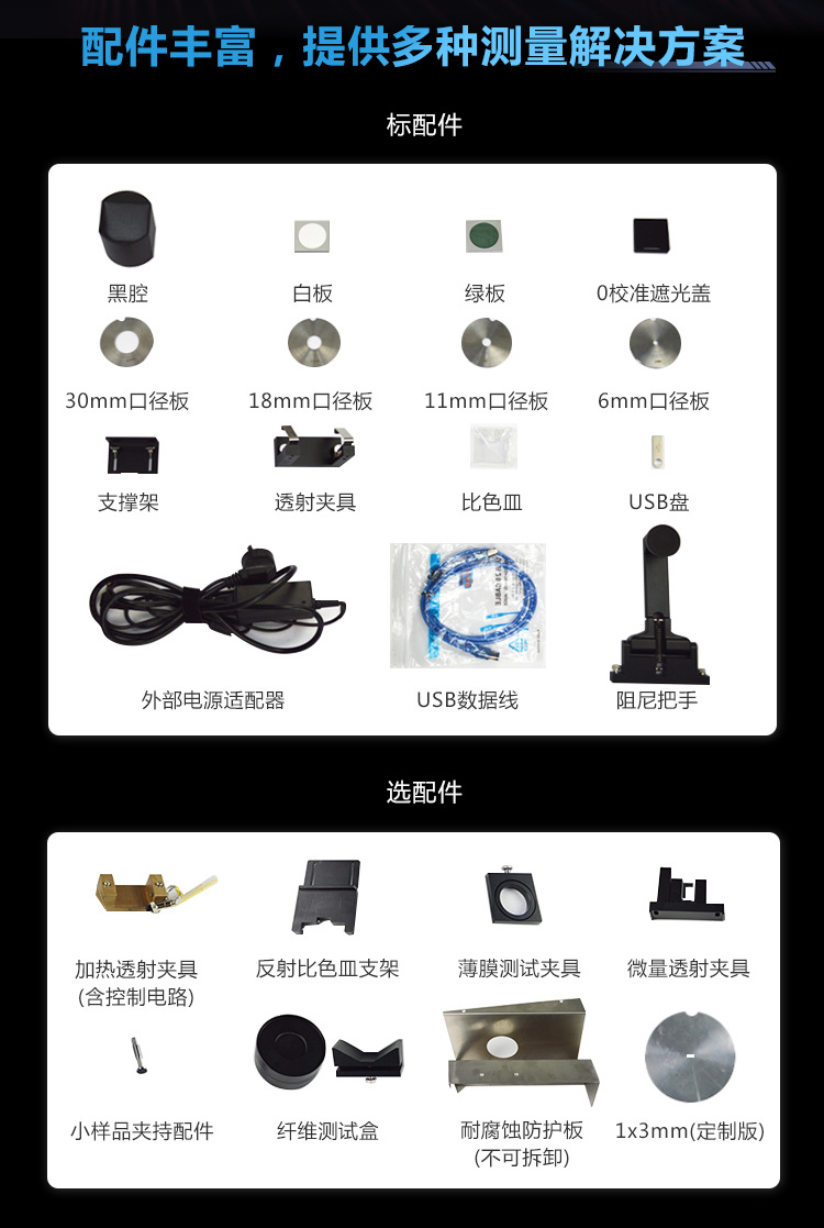 加熱透射夾具(含控制電路)、立式支架、氣動頂桿(含控制電路)、小樣品夾持配件、反射比色皿支架耐腐蝕防護板(不可拆卸)、纖維測試盒、薄膜夾具、微量透射夾具、拉桿箱、歐標插頭、美標插頭