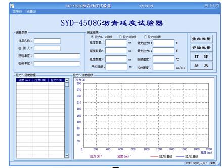 ⑵ 上位機保存試驗結果并畫出拉力曲線:將上位機與主機之間的RS232串口連線連好,運行配套光盤中的“SYD-4508G瀝青延度試驗器.exe”文件,軟件操作方法詳見“五、計算機軟件安裝及操作”。