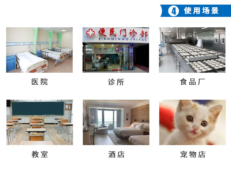 用于醫(yī)療機構(gòu)(手術(shù)室、治療室、供應(yīng)室、制劑室、病房)、需要消毒的公共場所、學校、有衛(wèi)生要求的生產(chǎn)車間、家庭居室等,進行室內(nèi)空氣消毒